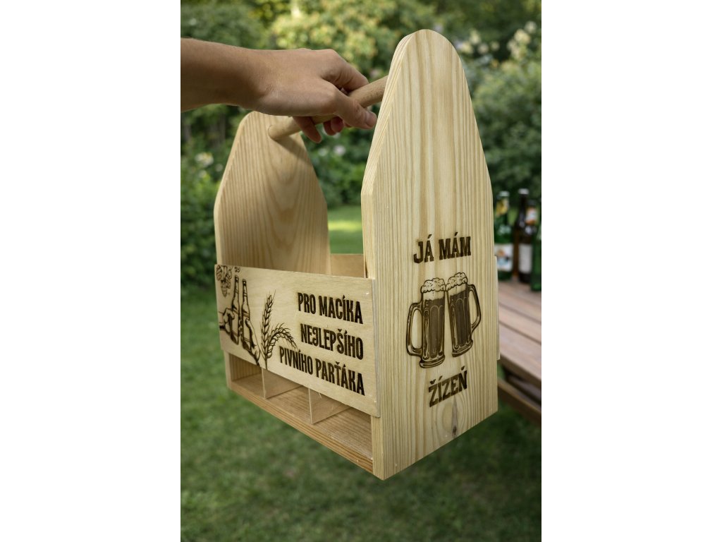 Dřevěný nosič na 6 pivních lahví s možností gravírování – originální dárek pro každého milovníka piva. Díky možnosti gravírování si můžete vybrat z několika motivů – nebo vytvořit zcela vlastní design, třeba s věnováním nebo jménem obdarovaného.