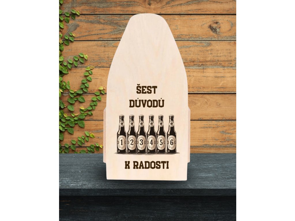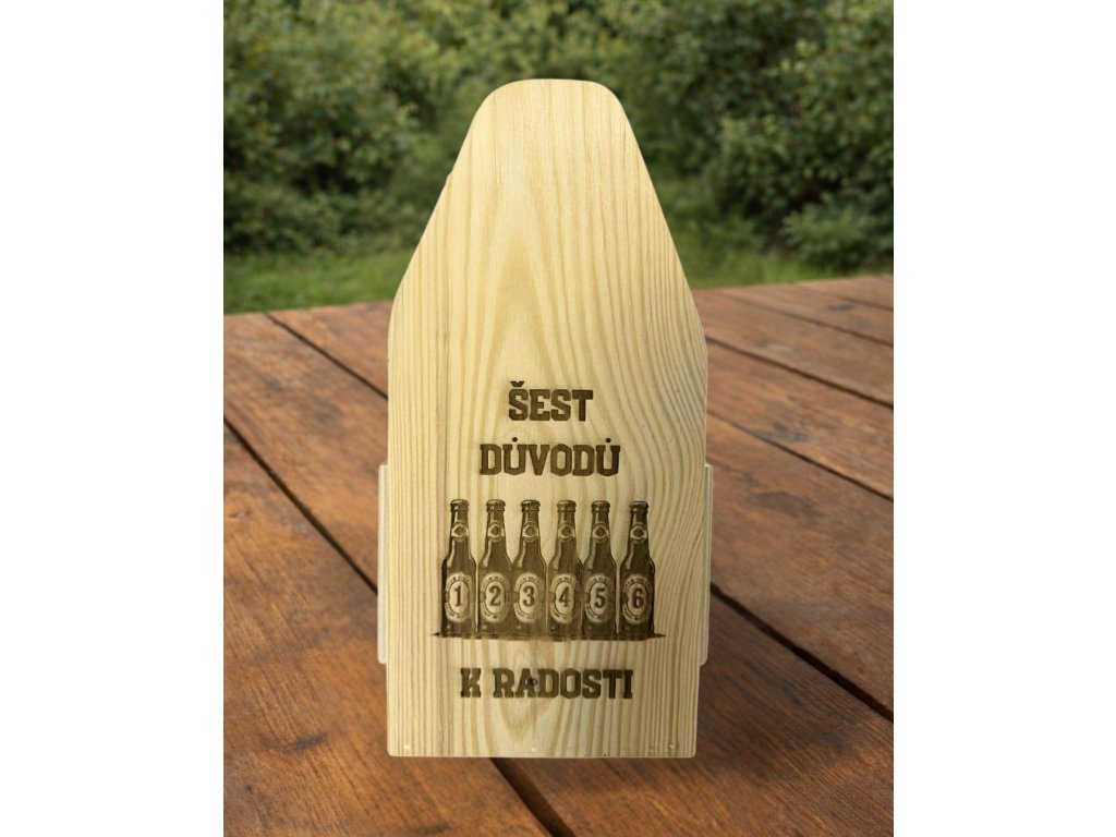 Dřevěný nosič na 6 pivních lahví s možností gravírování – originální dárek pro každého milovníka piva. Díky možnosti gravírování si můžete vybrat z několika motivů – nebo vytvořit zcela vlastní design, třeba s věnováním nebo jménem obdarovaného.
