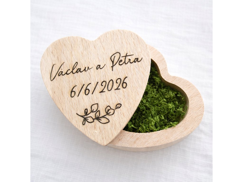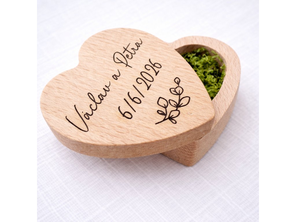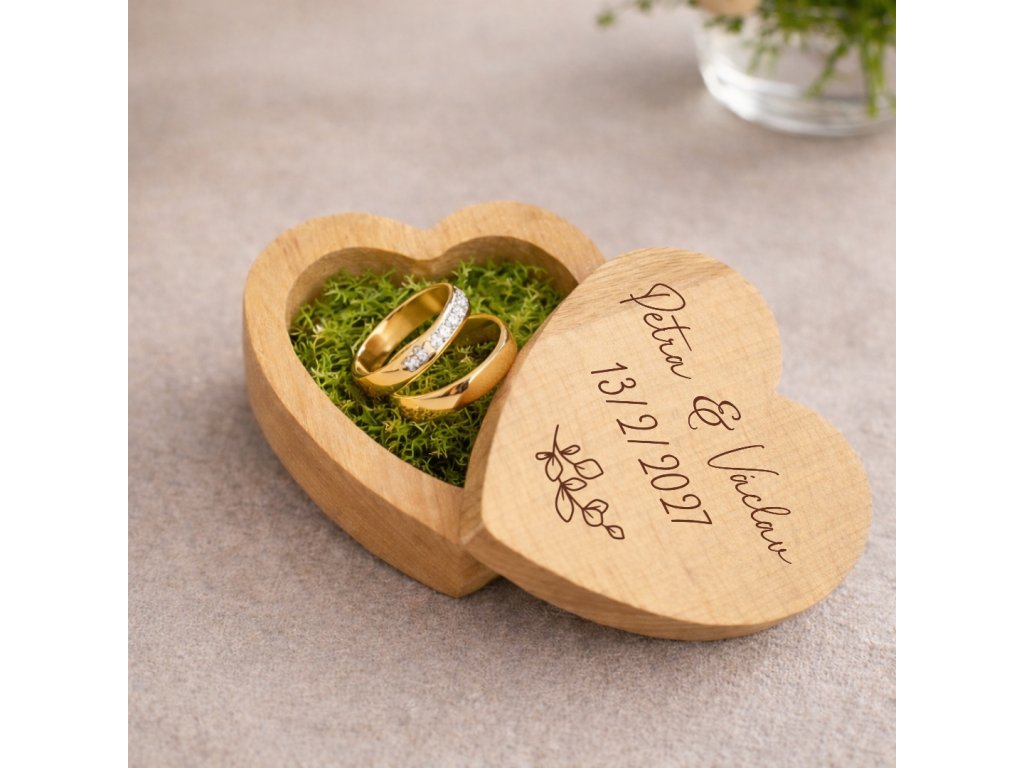 Hledáte elegantní a romantický způsob, jak při svatebním obřadu předat snubní prstýnky? Dřevěná krabička na prstýnky ve tvaru srdce je elegantní svatební doplněk, který krásně vynikne během obřadu i na svatebních fotografiích. Přírodní dřevo doplňuje zelený dekorativní mech, který dodává krabičce jemný a přirozený vzhled.
