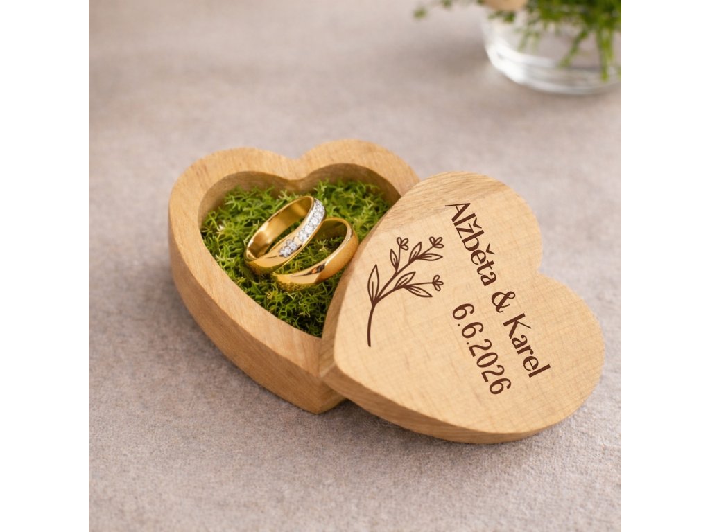 Hledáte elegantní a romantický způsob, jak při svatebním obřadu předat snubní prstýnky? Dřevěná krabička na prstýnky ve tvaru srdce je elegantní svatební doplněk, který krásně vynikne během obřadu i na svatebních fotografiích. Přírodní dřevo doplňuje zelený dekorativní mech, který dodává krabičce jemný a přirozený vzhled.