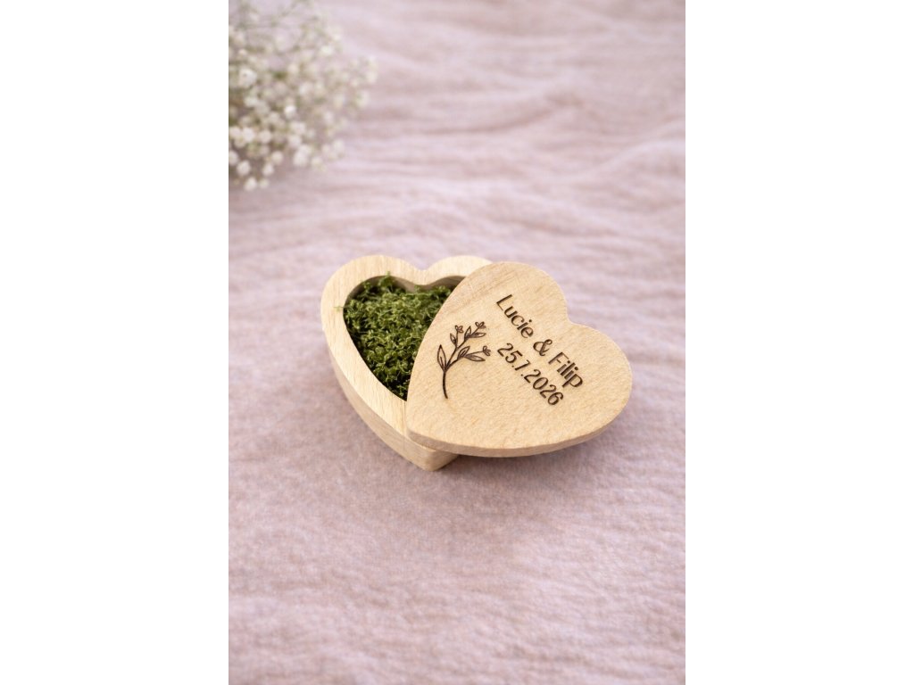 Krabička je vyrobena z kvalitního světlého dřeva s jemnou přírodní kresbou, která činí každý kus originálním. Uvnitř se nachází dekorativní zelený mech, jenž vytváří jemný kontrast k dřevu a poskytuje prstenu měkké a bezpečné uložení. Mech je umělý, bezúdržbový a dlouhodobě si zachovává svůj svěží vzhled – ideální pro uchování vzpomínek bez starostí.