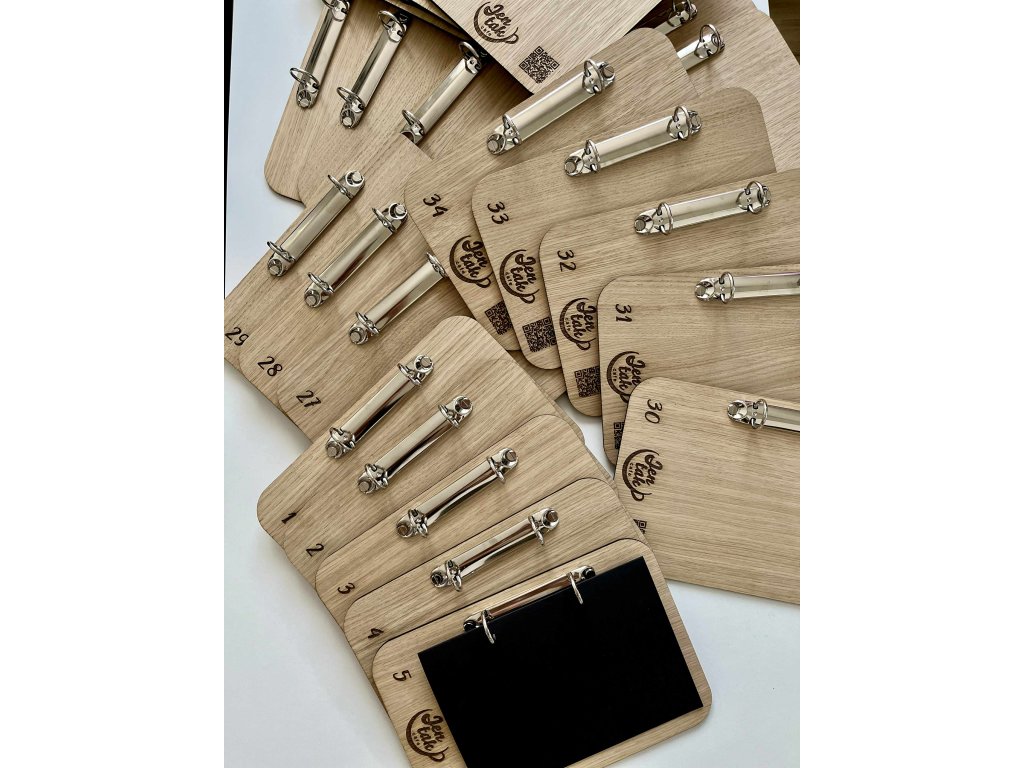 Desky lze personalizovat gravírováním loga, QR kódu pro digitální menu nebo čísla stolu, což zajišťuje profesionální a jednotný vzhled vaší provozovny. Kroužková vazba umožňuje snadnou výměnu jednotlivých listů menu a dlouhodobé používání bez opotřebení. Perfektní kombinace funkčnosti a stylu pro každou restauraci, kavárnu či bar.