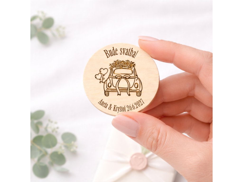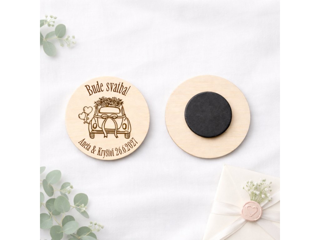 Hledáte drobný, ale smysluplný dárek pro své svatební hosty? Dřevěná svatební magnetka s motivem svatebního auta, doplněná o jména novomanželů a datum svatby, je elegantní a nadčasová památka, která v sobě spojuje přírodní materiál, jemný design a osobní význam.