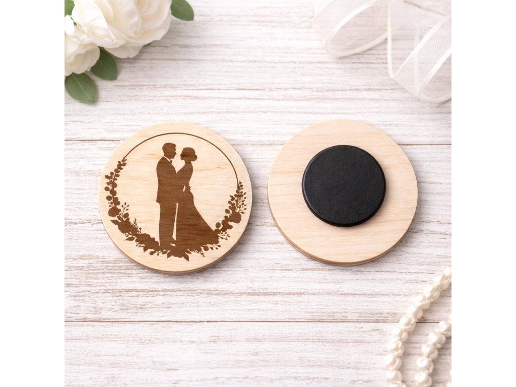 Svatební magnetky z březové překližky s gravírováním patří mezi nejoblíbenější dárky pro svatební hosty. Jsou praktické, krásné a zanechají trvalou vzpomínku na váš svatební den. Díky přírodnímu materiálu, jemnému laserovému gravírování a silnému magnetu se hodí jako svatební dekorace i jako drobný svatební suvenýr na lednici.