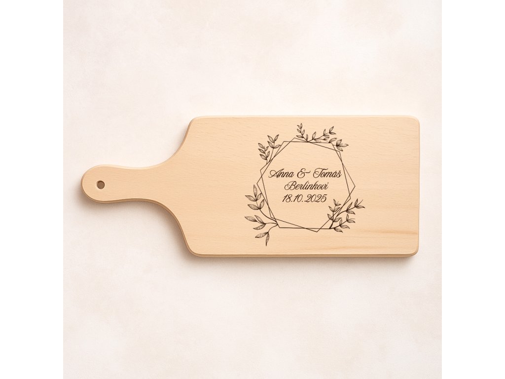 Elegantní dřevěné prkénko z kvalitního dřeva, které přidá kouzlo každé kuchyni. Je vyrobeno z kvalitního bukového dřeva a zdobené jemným gravírováním v podobě dekorativního věnce, uprostřed kterého jsou jména novomanželů a datum svatby. Díky elegantnímu designu se skvěle hodí jako svatební dar, doplněk do nového domova nebo i jako stylová dekorace – třeba zavěšená na stěně nebo vystavená v kuchyni.