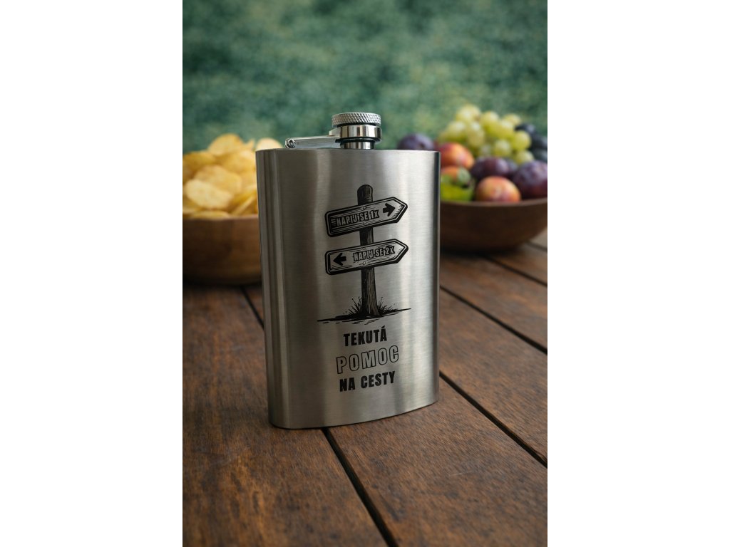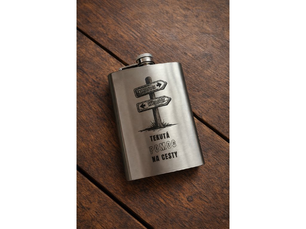 Nerezová placatka s gravírováním „Tekutá pomoc na cesty“ je vtipný, ale zároveň elegantní doplněk, který ocení každý milovník cestování, dobrodružství nebo jen drobných životních záloh.
