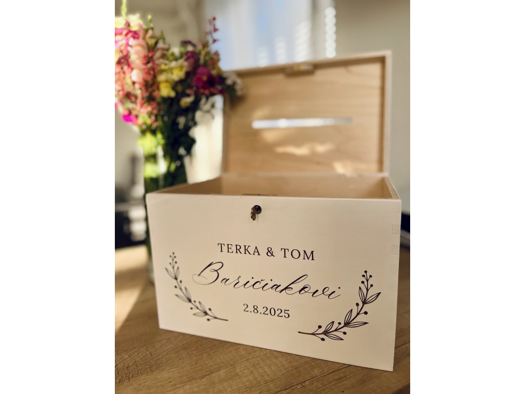 Elegantní dřevěná svatební truhla na přání, peníze a dary s možností personalizovaného laserového gravírování
