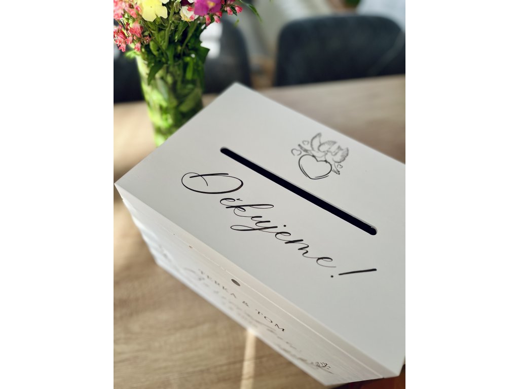 Elegantní dřevěná svatební truhla na přání, peníze a dary s možností personalizovaného laserového gravírování