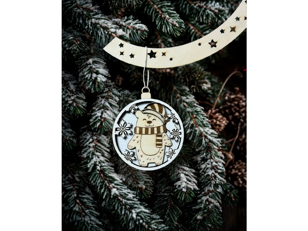 Vyřezávaná dřevěná 3D vánoční baňka s motivem medvěda, vyrobená z březové překližky v přírodní a bílé barvě. Hodí se k zavěšení na stromeček, adventní věnec nebo jako...