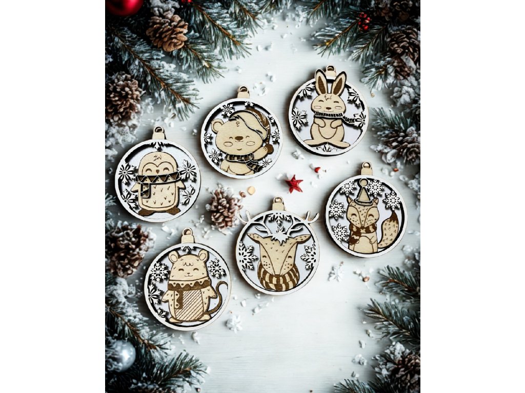 Vyřezávané dřevěné 3D vánoční baňky s motivem zvířátek v sadě 12 ks, vyrobené z březové překližky v přírodní a bílé barvě. Hodí se k zavěšení na stromeček, adventní věnec...