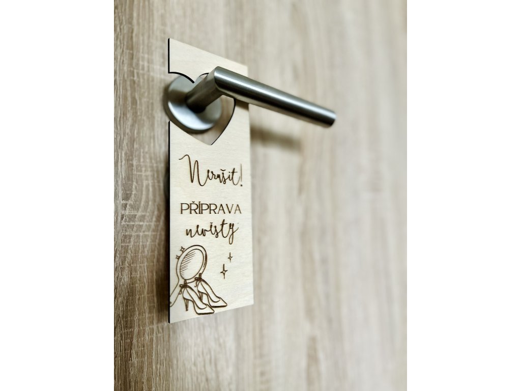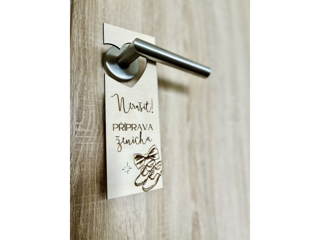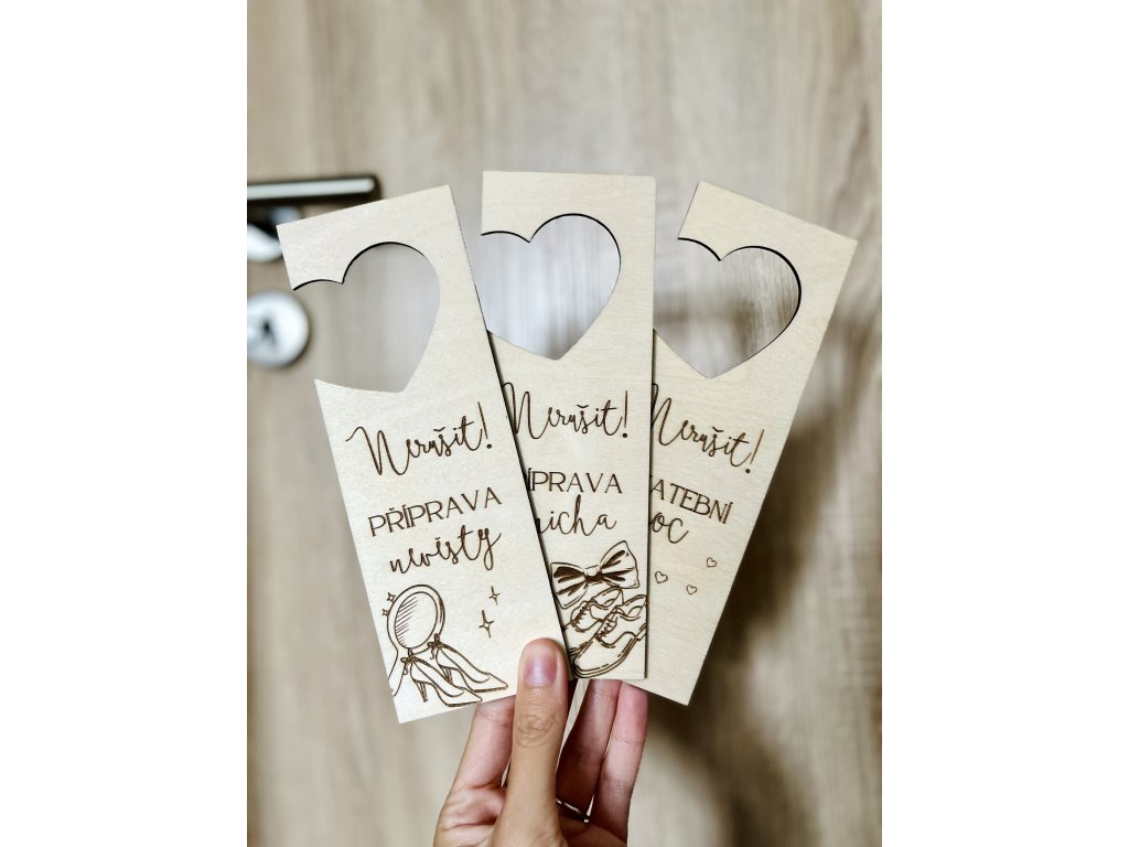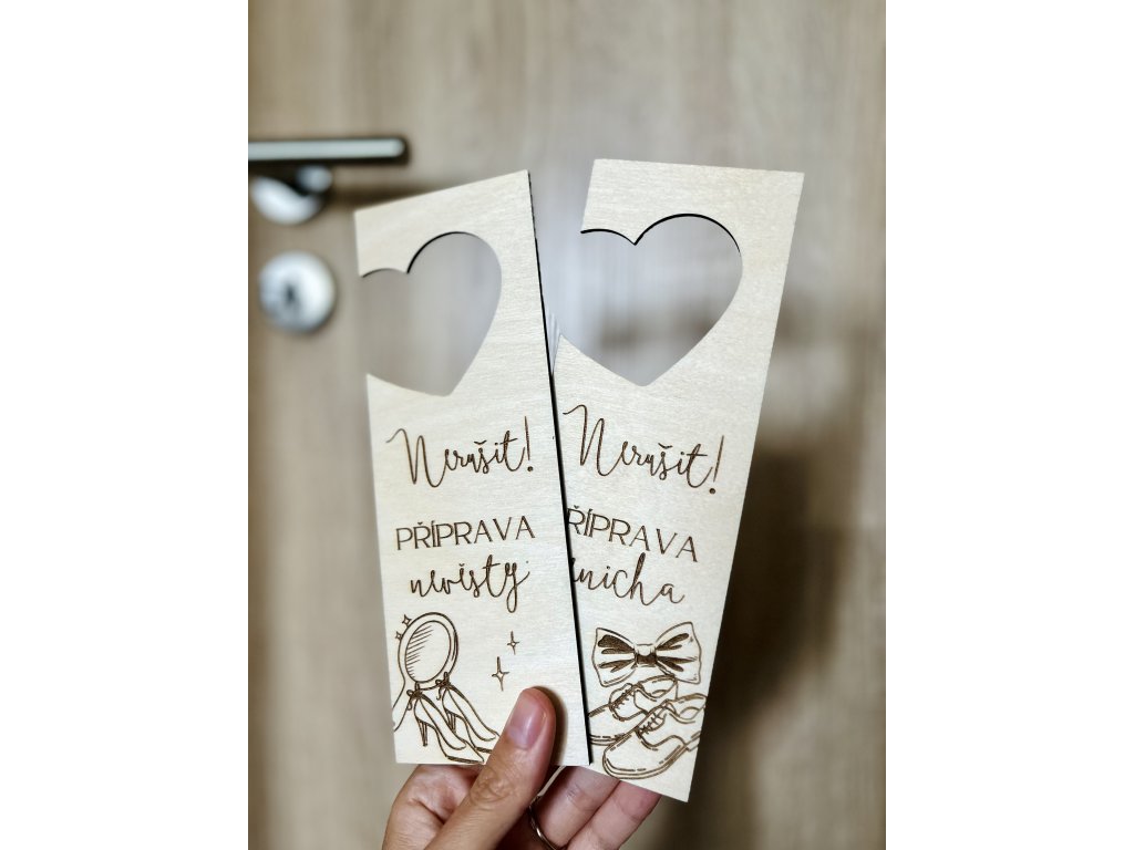 Tyto dřevěné cedulky na kliku jsou nádherným doplňkem svatebních příprav i první svatební noci. Elegantní gravírované nápisy: